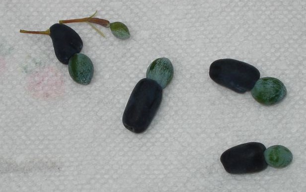 A: My friend Shannon Pable ID’s them as fruit from a podocarpus. This shrub is not reliably hardy in the suburbs but I see them growing quite large in the city.