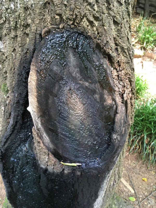 Q: A tulip poplar sits right over our koi pond. It had a fork in the trunk about four feet above the ground. A year ago the smaller trunk of the two showed obvious signs of dying. A tree service removed it. But when I asked them what they were going to seal the scar with, they said it was not necessary. Ever since, the scarred area has produced a black liquid that remains wet to the touch. The remaining trunk seems healthy and full but we’re worried that the bleeding process may be a sign of future problems.