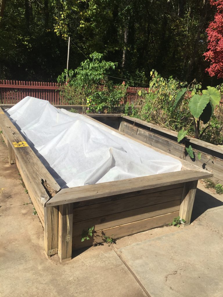 My favorite plant covering is “frost cloth” (click for sources), a spun polyester material that can be draped over plants.