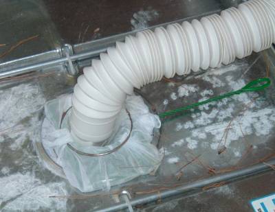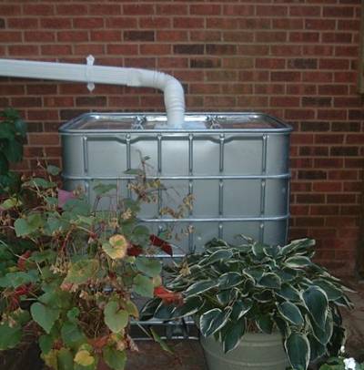 I discovered these industrial beverage containers at a local bait and tackle shop that hold 275 gallons! I took my dad to see them and we decided that this was the ticket. The plastic container is completely encased in galvanized metal and it also sits about 2-3 inches off the ground. It has a 6-inch opening in the top and I used a large aquarium net (lined also with extra netting to prevent debris from entering the tank) to cover the opening, then dropped the flexible gutter into the opening…I secured this with a metal clamp.