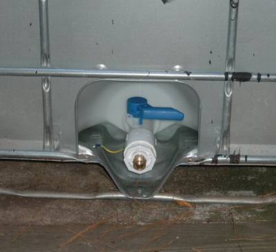 At the bottom of the container on one side is a valve that is opened and closed with a lever…I added an attachment of PVC pipe and a spicket to attach my hose pipe so I can water my plants. As you can see from my photos, the container is nice looking and blends in well with my potted plants. For an overflow valve, all I have to do when the container is full, is carry the hose pipe to surrounding plants and shrubs, open the valve and slowly water until I have drained the tank to the point I think it needs to be.