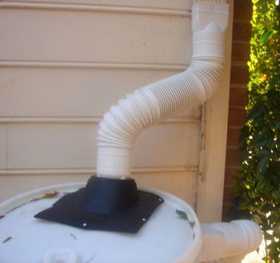 The two pieces of flex gutter pipe are for the tank input and the tank overflow output. One flex piece is connected (with screws to hold it) from the gutter coming down from the side of the house, which I cut a section out of, to the tank input. The other piece of flex goes from the tank overflow output to the gutter drain pipe going into the ground. Keep in mind that all gutter interfaces, going in the direction of flow of water, need to go from a smaller pipe fitting into a larger pipe (or else be a watertight fitting).