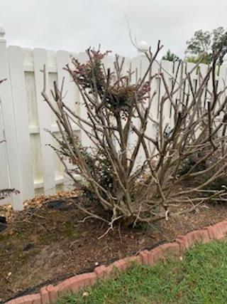That said, you don’t have a problem. Completely remove the bare limbs and let the loropetalums grow to the size you want.