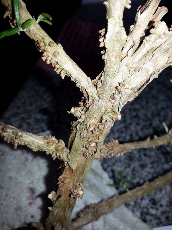 Q: A scaly growth is infecting my three-year old rosemary bush. It seems to be on the older stems.