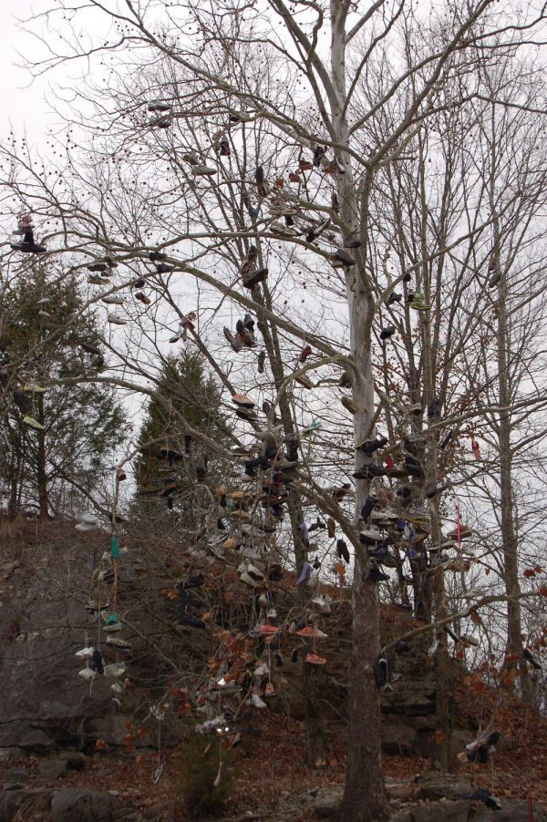 Q: This tree grows along US Hwy 72 in north Alabama, just a few miles from the Mississippi line. I pass it when I go to west Tennessee to visit my Mom. I’ve been watching it’s “fruit” increase over the years. I suggested to my husband that we get a cutting from it and try to grow our own shoes, but he gave me one of “those” looks and kept driving.