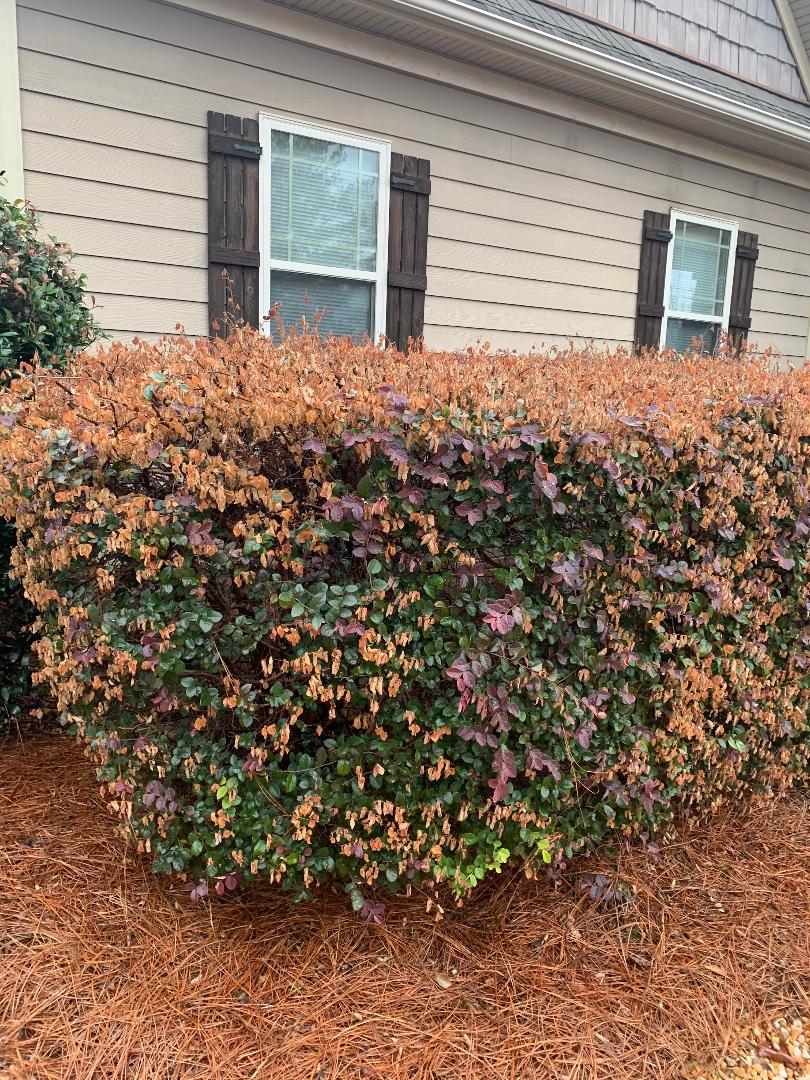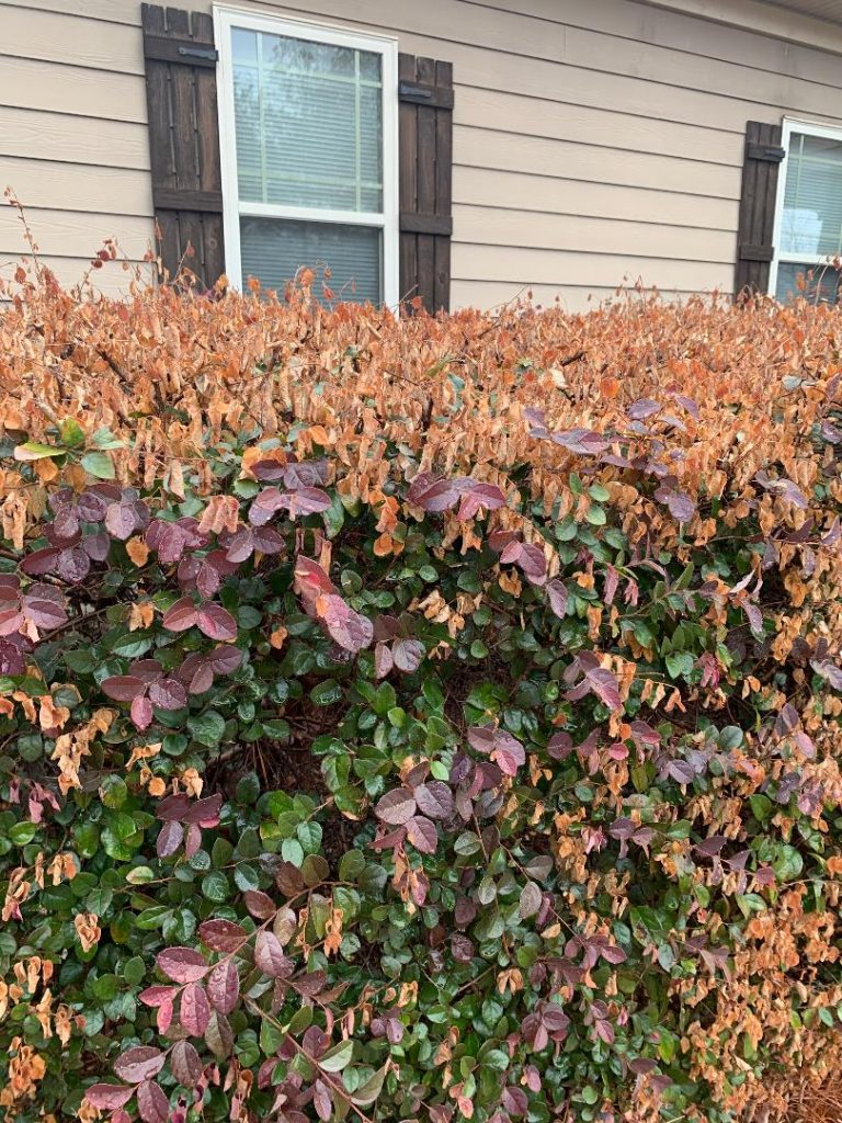 Back in August, your loropetalum shrubs had grown vigorously and were covering the windows. So you decided to trim them down. There was plenty of warm weather afterwards, so the shrubs put out fresh new growth. It grew 3″-4″ before cool weather arrived in November. But all that new growth never really prepared itself for cold weather.