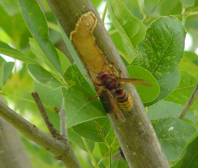 Both hornets and wasps strip soft bark from healthy plants to use in making their nests. European hornet goes so far as to feed on sap released by their chewing. A European hornet resembles a cicada killer wasp but is wider and has more hair on the thorax and abdomen. It nests in hollow trees, as compared to the bald-faced hornet, which builds its paper nests in trees and shrubbery.