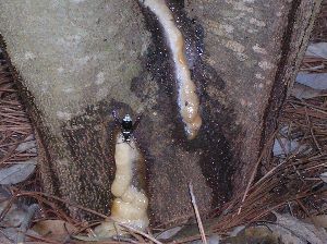 An infection can also be caused by a wound on the trunk surface or it can be deeper inside the trunk. In either case, bacteria ferment the tree’s sap; it seeps out and down to the ground. Sweet-eating insects (wasps, bees, yellow jackets) would obviously be attracted to the damaged area.