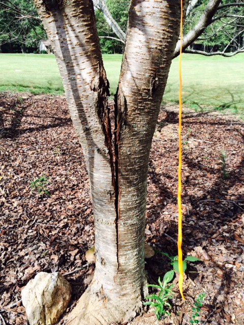 Q: One of my large flowering cherry trees split down the middle. Can I save it by putting a strap around the tree and pulling it back together?