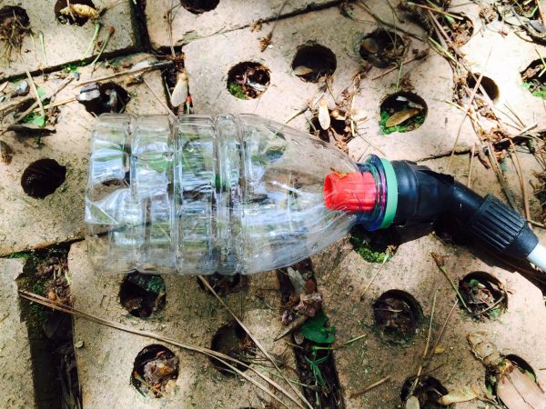 Making it was pretty straightforward: I cut the bottom out of a plastic bottle, stuck the nozzle in the top, and secured it with tape.