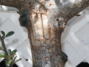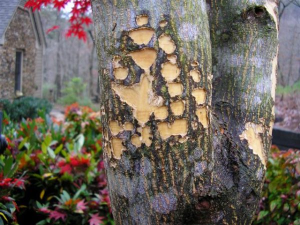 Q: I just noticed today that something is eating our seven-year old Japanese maple. The damage looks fresh. There are plenty of bark chips all around the base. This tree has been beautiful and we would hate to lose it. Do you have any suggestions as to what is happening to our tree and what should we do?