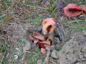 Q: I recently visited my father in south Georgia (Seminole County), and was curious about a mushroom or fungus that was growing in his yard. It looks as if it’s from another planet! I did notice that there were several flies and beetles attracted to it. Thanks for any information you can give me on it!