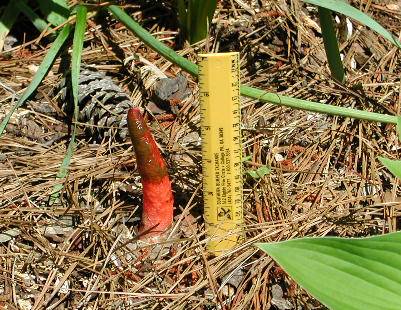 Elegant stinkhorn, Mutinus elegans, (and also M. caninus and M. ravenelii), has a orange-pink shaft and a dark, tapered head.