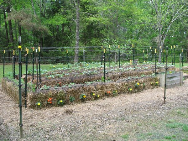 I have a total of 45 bales; plants include tomatoes, squash, cucumbers, cabbage, brussell sprouts, broccoli, lima beans, butter peas, green beans, English peas, parsley, thyme, basil, rosemary, dill, and, of course, marigolds and impatiens to “pretty it up”.
