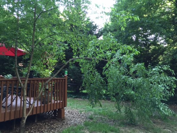 A: I hate to recommend removing a branch that’s healthy but severely bent. My advice is to get some 1″ wide belting, wrap one end around the bent branch and the other end around a strong upright trunk of the tree. This will allow you to pull the weak branch back into place.