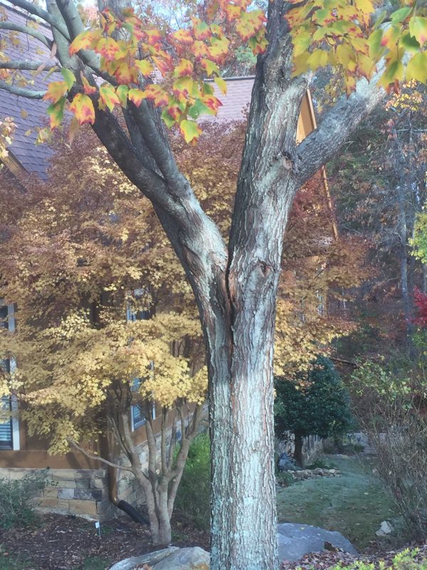 A: This is a perfect example of what can happen if “co-dominant trunks” are allowed to grow from a single trunk. As the two grow longer, they pull the trunk below apart.
