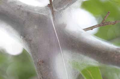 There are a million small brown insects (smaller than a pencil point) swarming all over the tree branches underneath the veil of webbing. There is a great deal of green frilly lichen attached to the tree as well, which they seem to be attracted to.