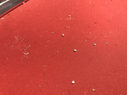 Not a one-time thing. It started in July and some days are worse than others. Oddly enough, when it began we were not moving a lot of earth at the construction site at the time. We have increased our dust control measures, just in case. The droppings are sporadic/scattered about and mainly on his property, although I have found some at the treatment plant under the tree canopy as well.