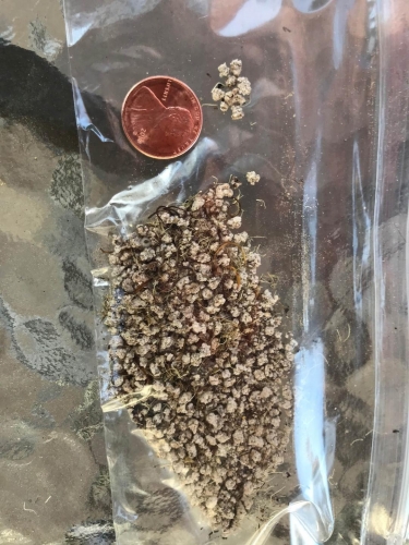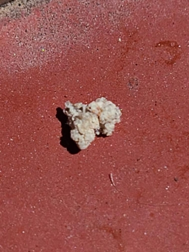 “I am a project manager for the City of San Diego and we have a construction site at a water treatment plant. In the neighborhood next to the plant, the residents are finding these balls or clusters on their property. One resident has swept them into a pile and that is what you see in the photos. There is also some eucalyptus debris mixed in there too. The particles only appear near or under the tree canopy. The clusters are hard, but can be easily crushed into fine particles between your fingers. The resident states that when he washes them down, they are a little slimy (clay or ?).”