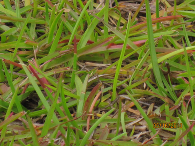 “Vary the mowing pattern and don’t follow the same tracks each time. Mow at right angles and perpendicularly to the pattern seen here. Also avoid mowing when the grass is drought stressed. This is not a major concern and will disappear on its own as new growth replaces older leaves.”