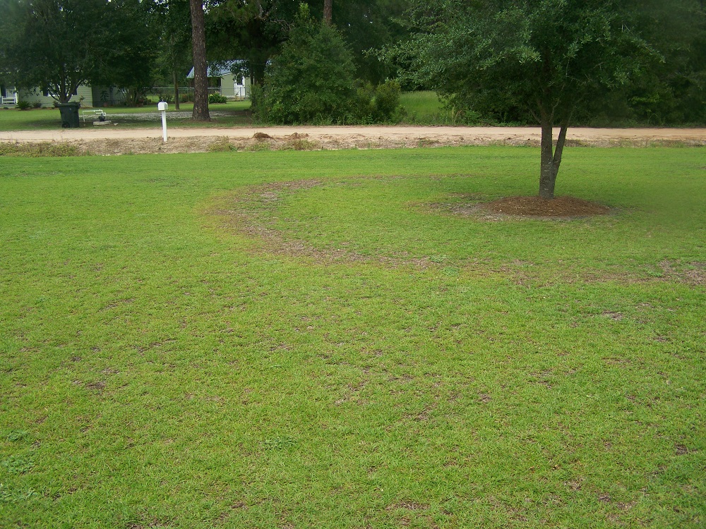 Q: I have a perfectly circled ring of dead centipede grass around my oak tree. I have another oak tree about 50’ from this one that doesn’t have this problem. The ring seems to grow larger every year as the tree grows.