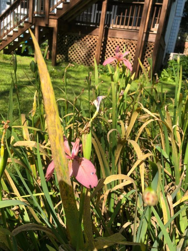 A: The yellow flag irises in the back are a different iris species than the others so that’s maybe why they don’t have the leaf spot.