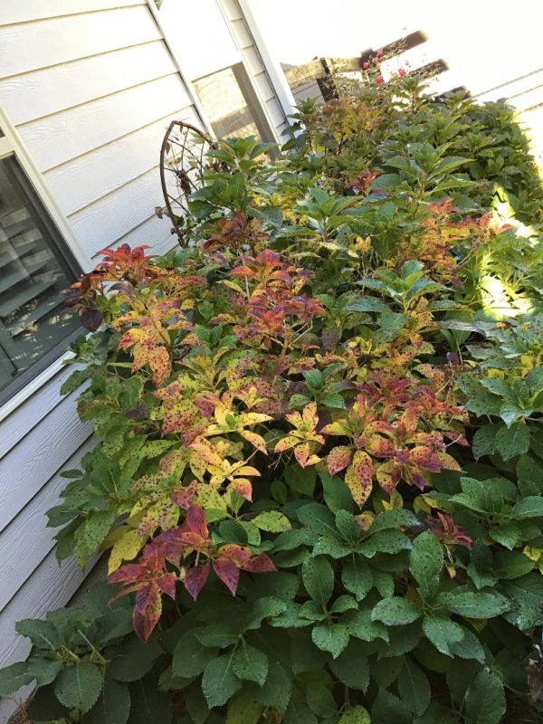 Q: My hydrangea bushes looked great earlier this summer, then we left for a couple of vacations. The irrigation system was set to spray twice a week and ½ inch of water applied at a time. We came home and there were purple spots all over the bushes.