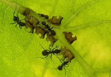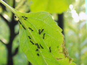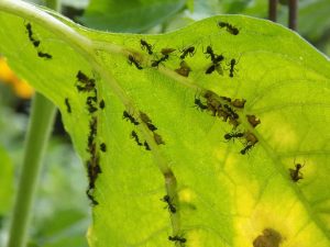 Q: A couple of weeks ago, I was out weeding under the tall sunflowers we had planted. Something bit me, and I realized it was a huge black ant on the sunflower leaf. It wasn’t a sting, it was literally a bite. When I looked up, I realized the undersides of many of the sunflower leaves had masses of large black ants. They seemed to be congregating, not just wandering aimlessly. Any idea what they were doing?