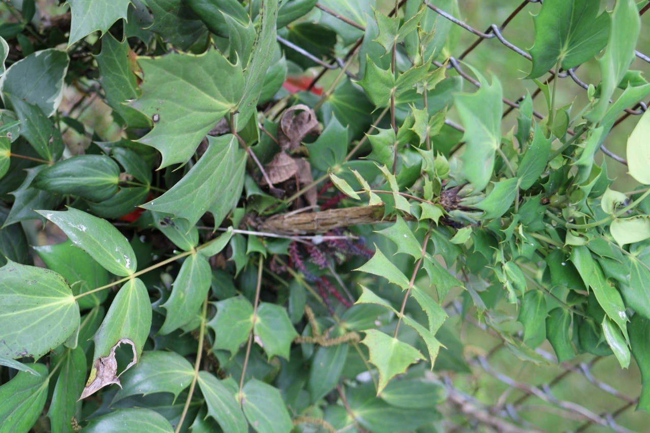 Maybe a species in the Mahonia genus? Possible the leatherleaf M. bealei?