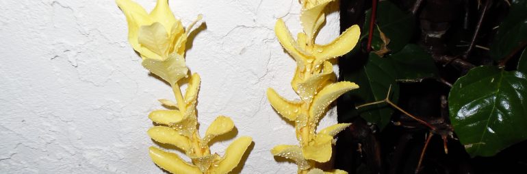 This all-yellow plant (all leaves, no flowers) is growing out of the exposed 2X4 under the … Continue reading All-yellow plant