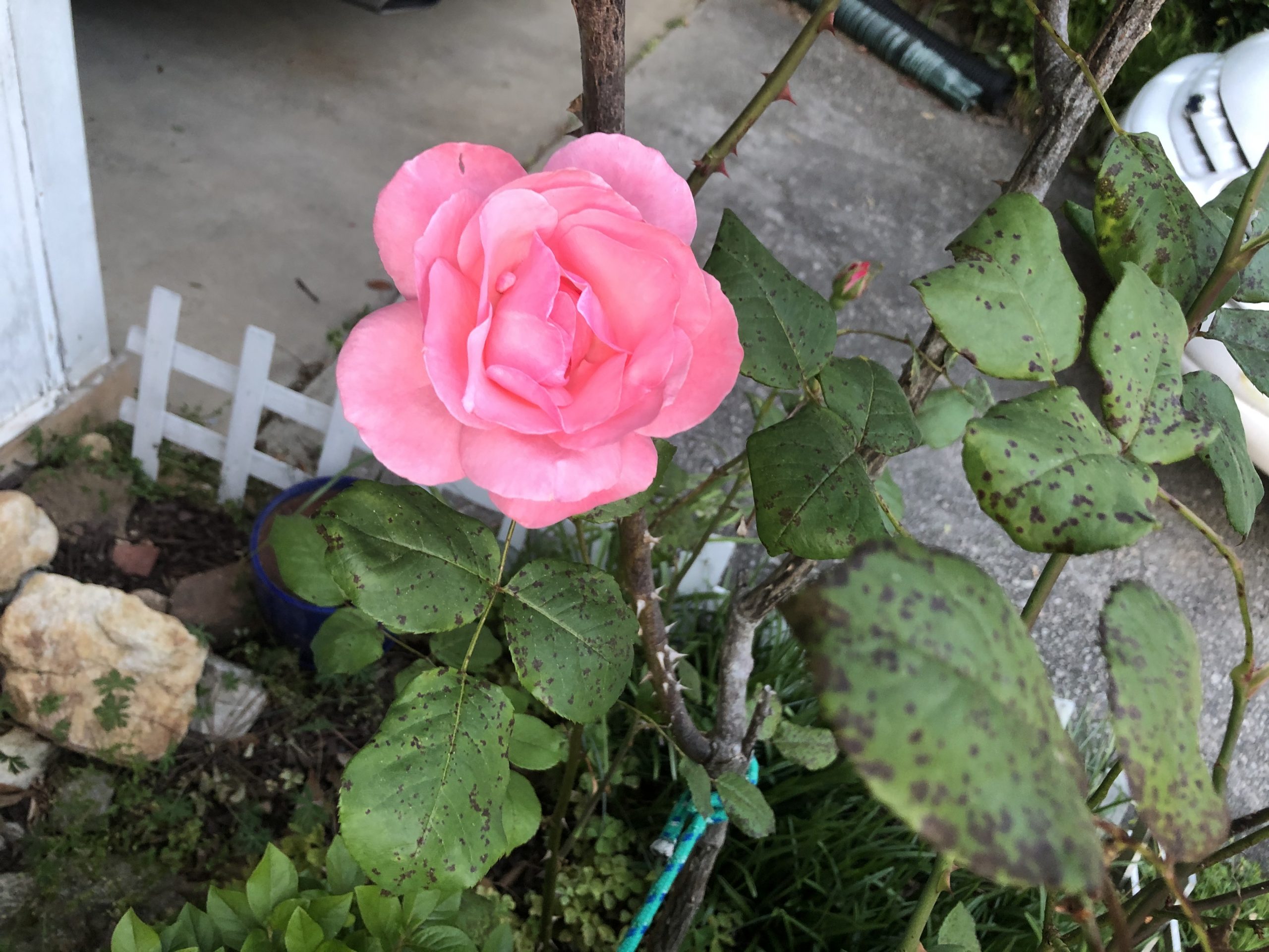 Mature Pink rose in mostly sunny bed with spots on its leaves.