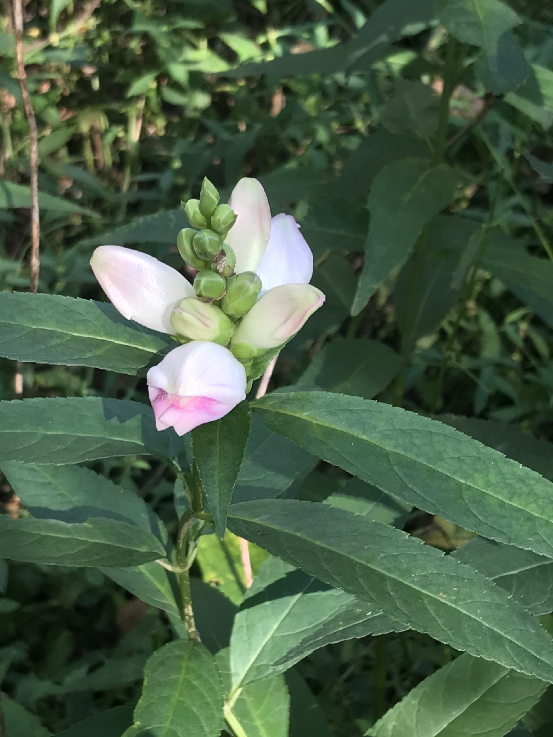 Maybe a type of turtlehead plant (Chelone)? Possible the white flower speccies ( C. glabra)? Check out the included link below for more information and see if you have a match. Best wishes!