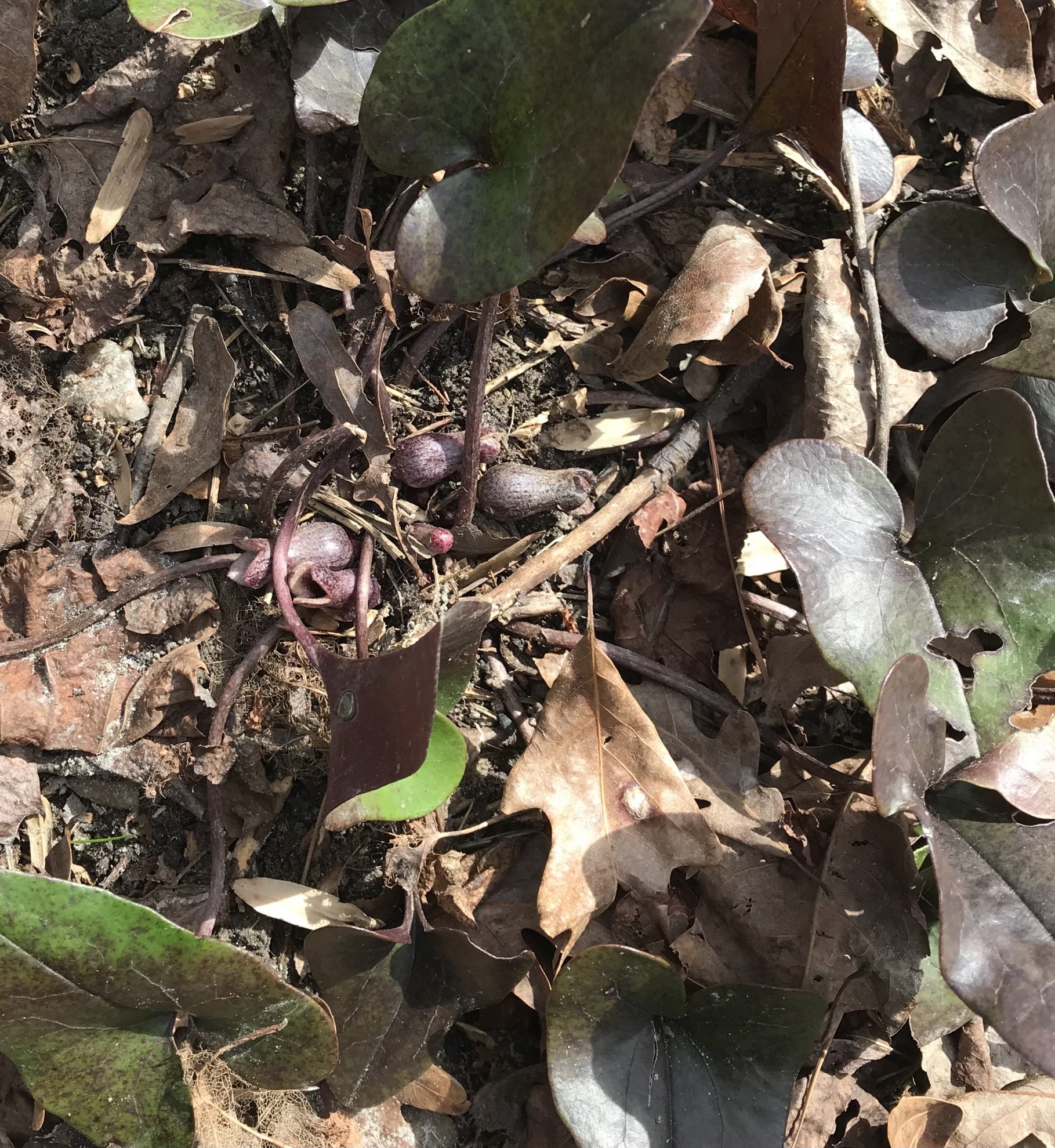 Maybe a species of heartleaf (Hexastylis)? Copy & paste the included link below and check out one of the species in the genus the Hexastylis arifolia var. arifolia (Little Brown jug/ Arrowhead Heartleaf). Click on images to enlarge. Best wishes!
