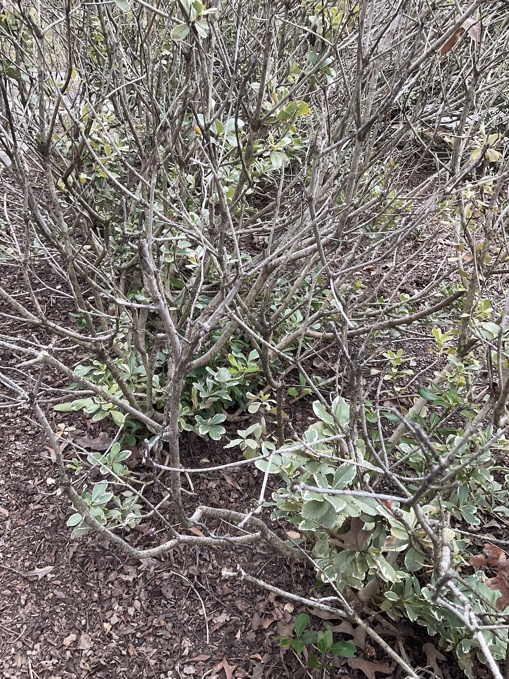 Maybe Japanese pittosoprum ‘ Variegata” (Pittosporum tobira )? Check out the included link below for how to identifying pittosporum freeze damage & tip on proper pruning. Hope this will help you to decide whether to save or replace the shrub. Best wishes!