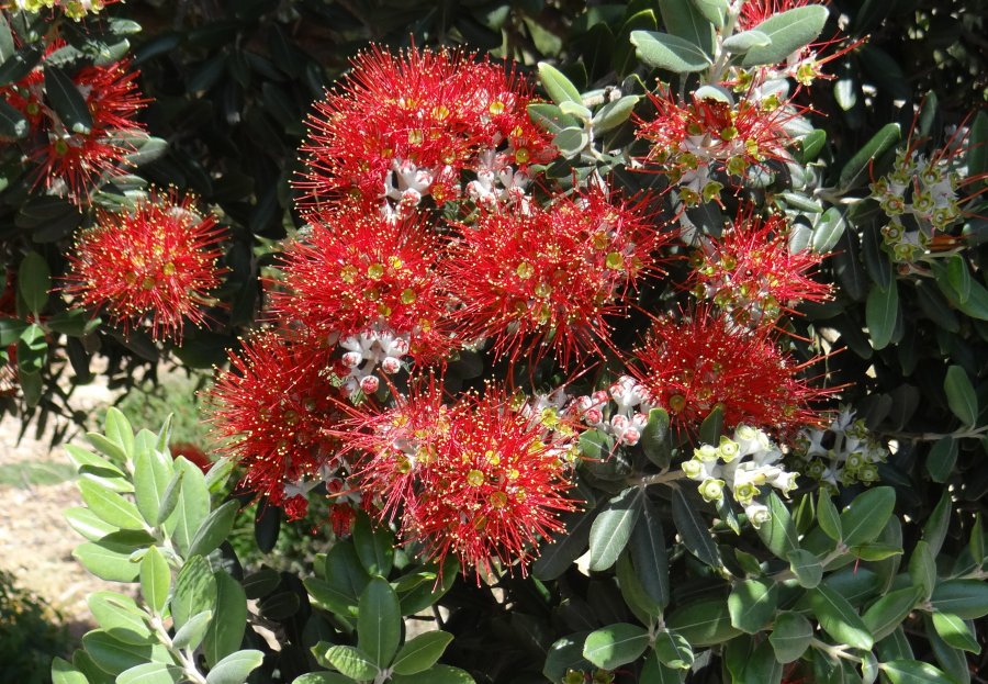 Maybe a species or one of the cultivars in the Metrosideros genus? Check it out and see if you have a match. The included link below is for one of the species, M. excelsa (New Zealand Christmas Tree). Best wishes! https://www.smgrowers.com/products/plants/plantdisplay.asp?plant_id=1058