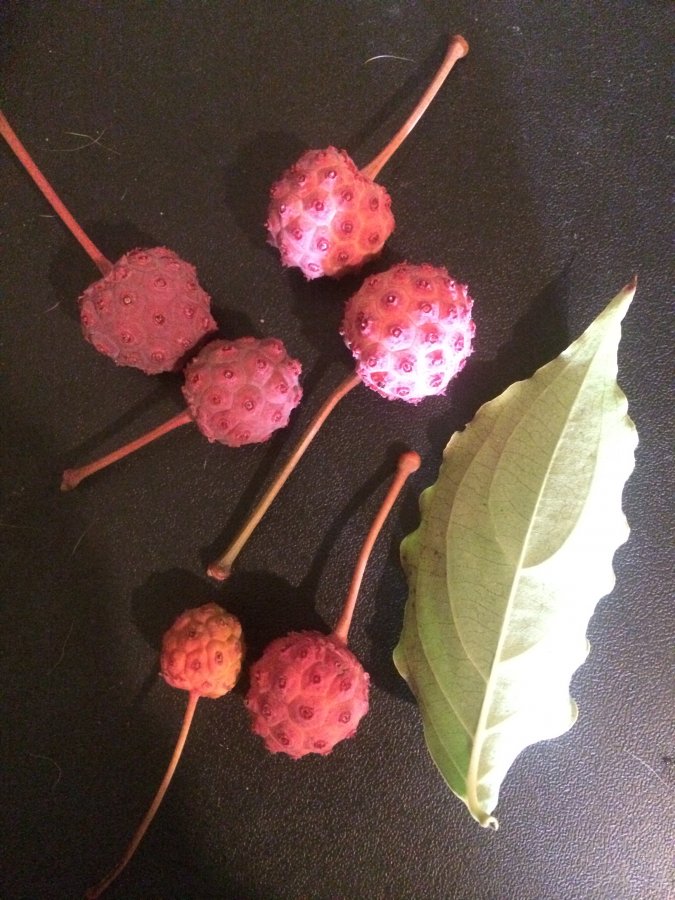 Shrub of about 6 feet. The bark was relatively smooth with thin, half centimeter white lines. Berry smells good when opened.