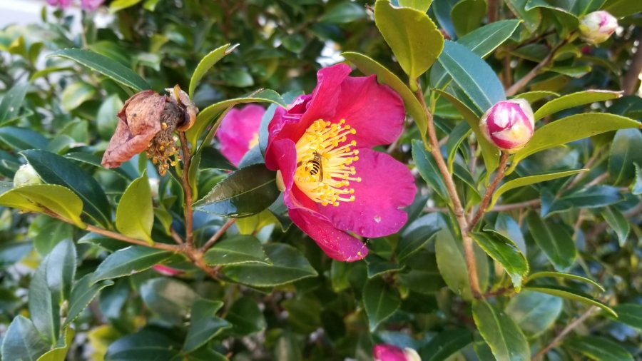 It is Camellia sasanqua. https://en.wikipedia.org/wiki/Camellia_sasanqua