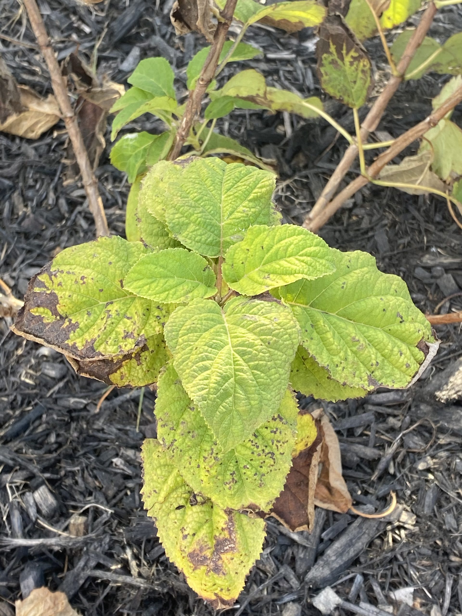 i planted three annabelle hydrangeas in the spring of 2020. they were doing extremely well but now the leaves have turned light green/yellowish and they developed brown spots on the leaves. they have a balance of sun and shade and i make sure not to over water them.