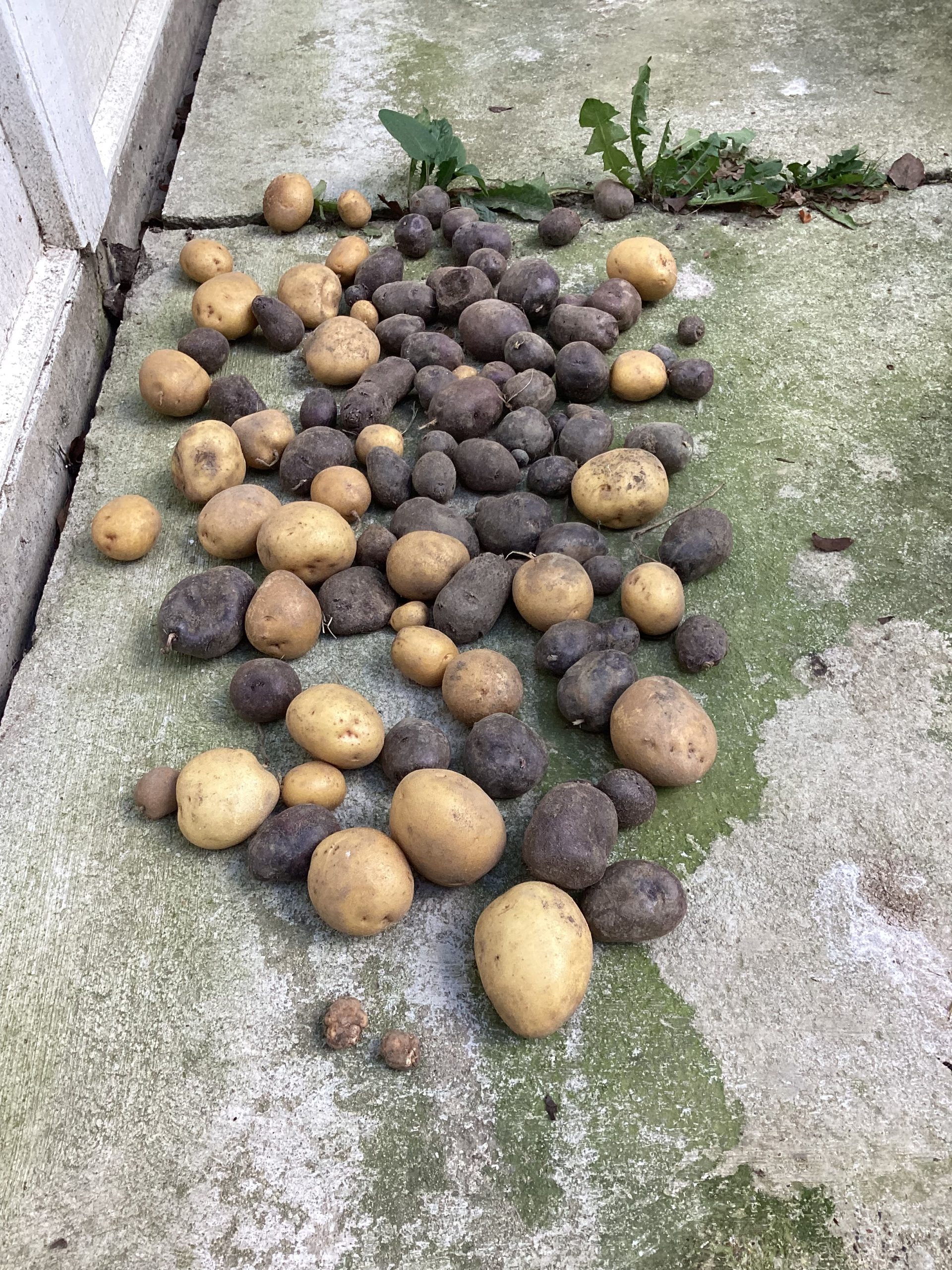 The two small tubers in the upper left and in hand. I dug these up in the row of my Adirondack Blue potato row. Area was weed free but potatoes were planted where I had grown gladiolus and cypress vine last year. Does not look like even a deformed gladiolus bulb and I ‘m not sure if cypress vines have a tuber. Both the ornamental plants over wint