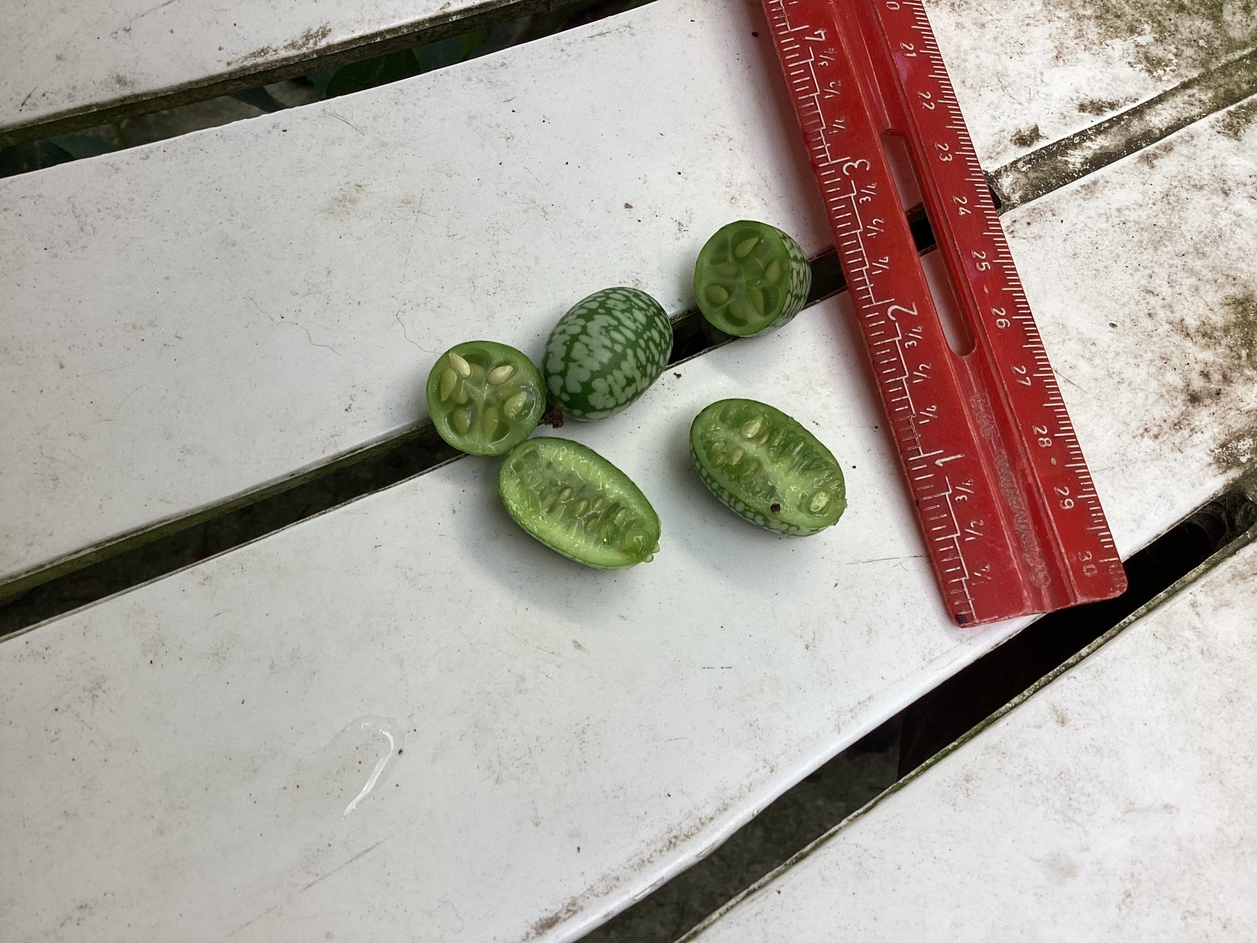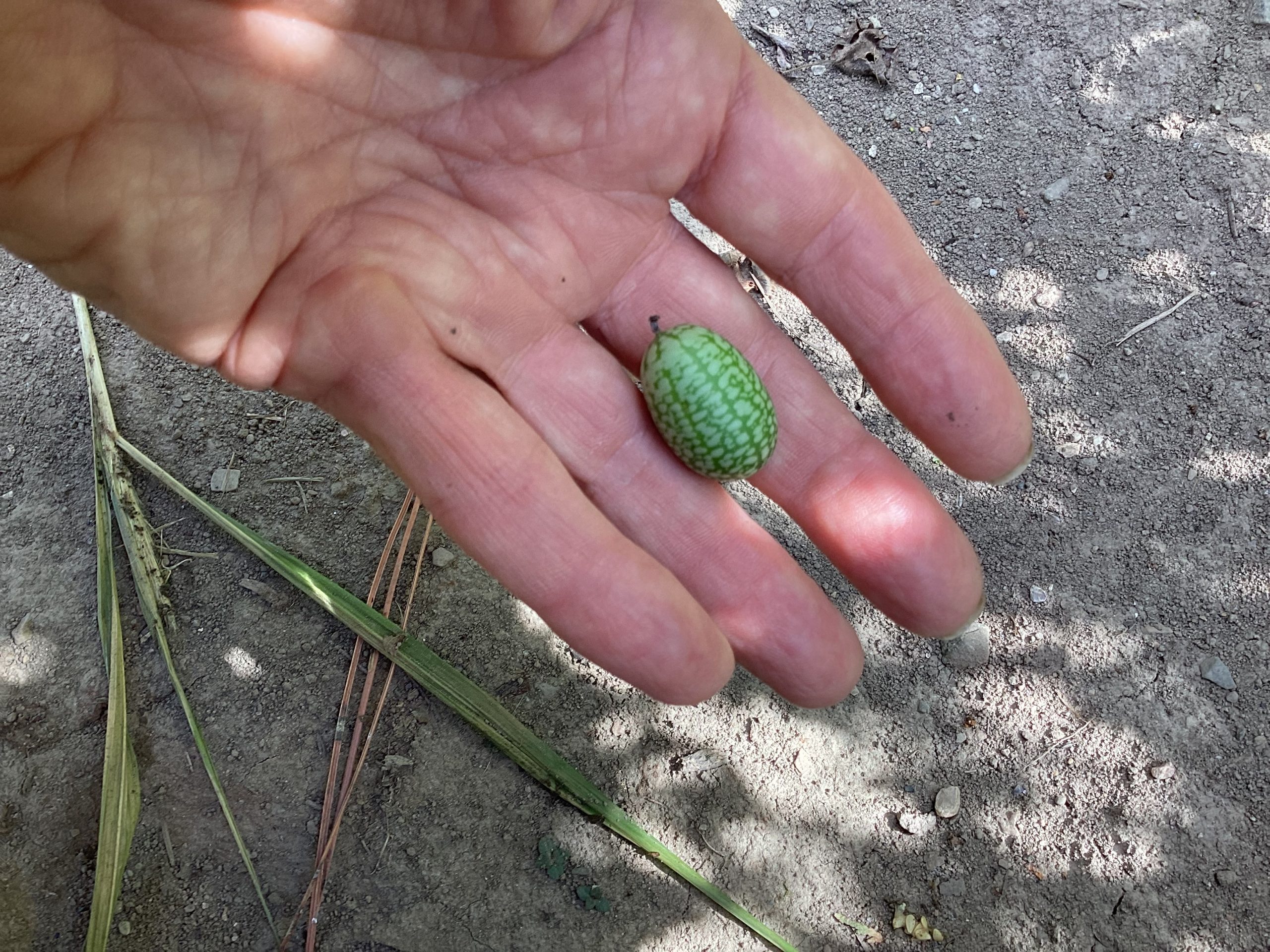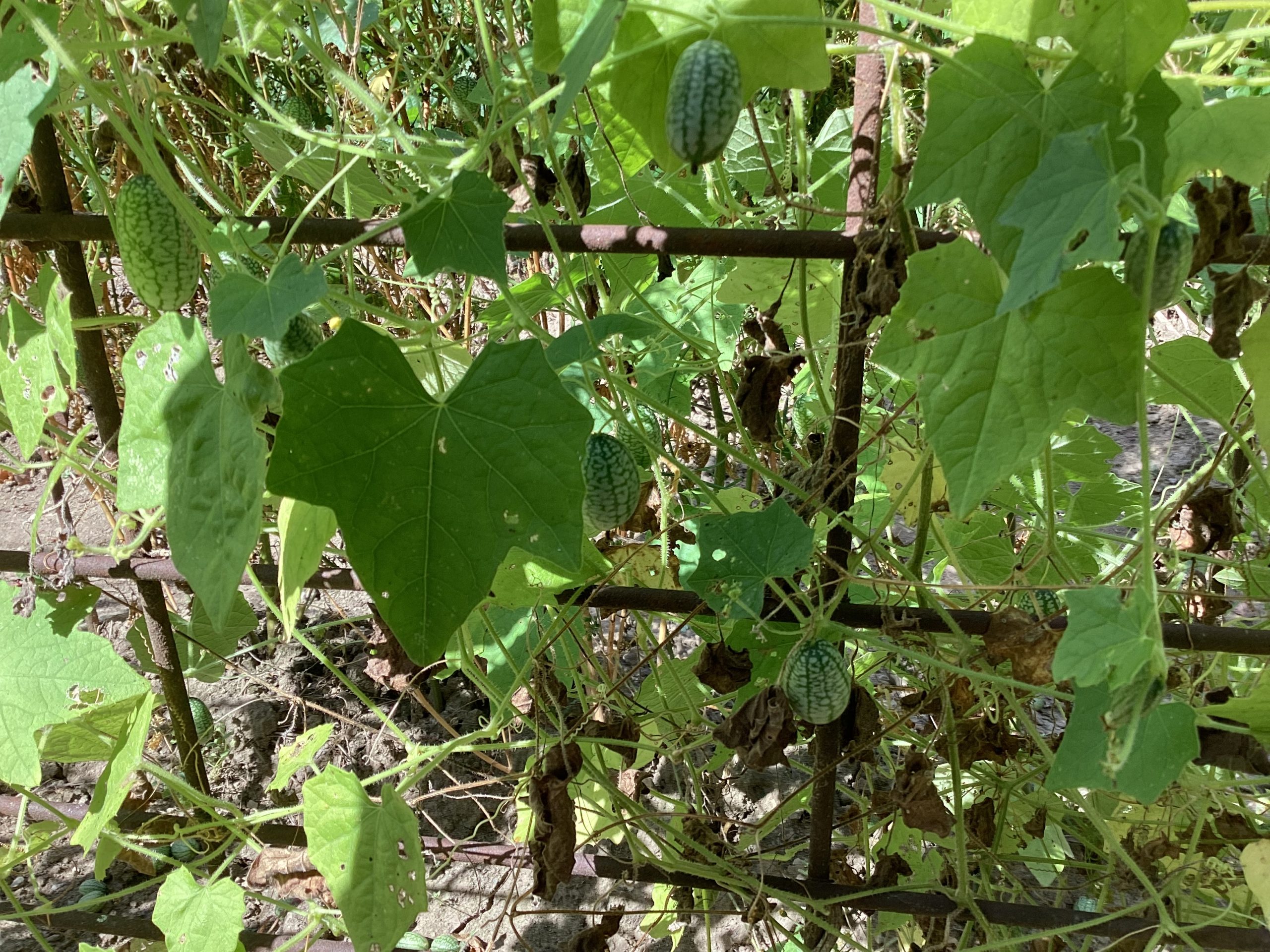 Cute miniature watermelon-like. Growing on a climbing vine.