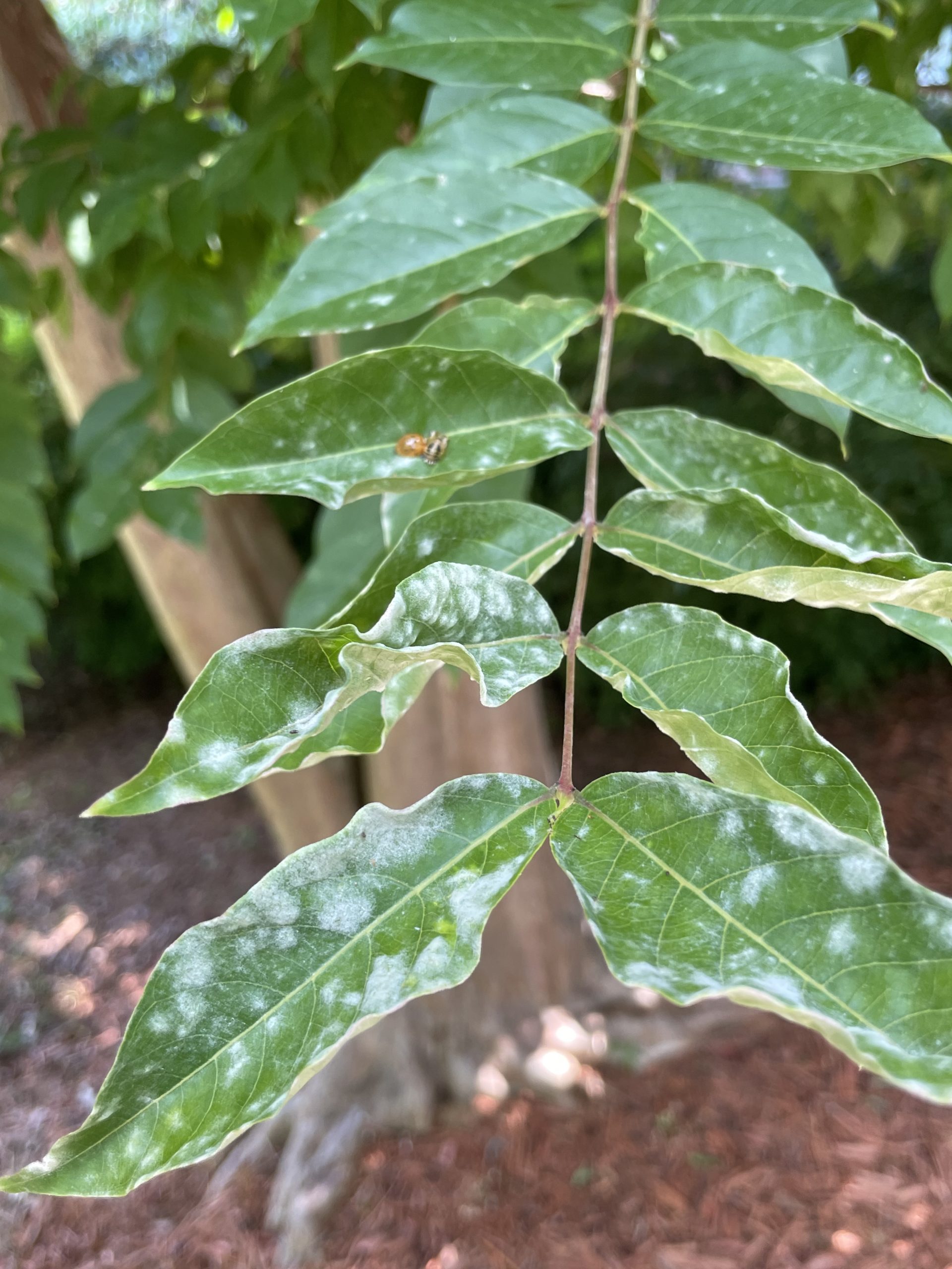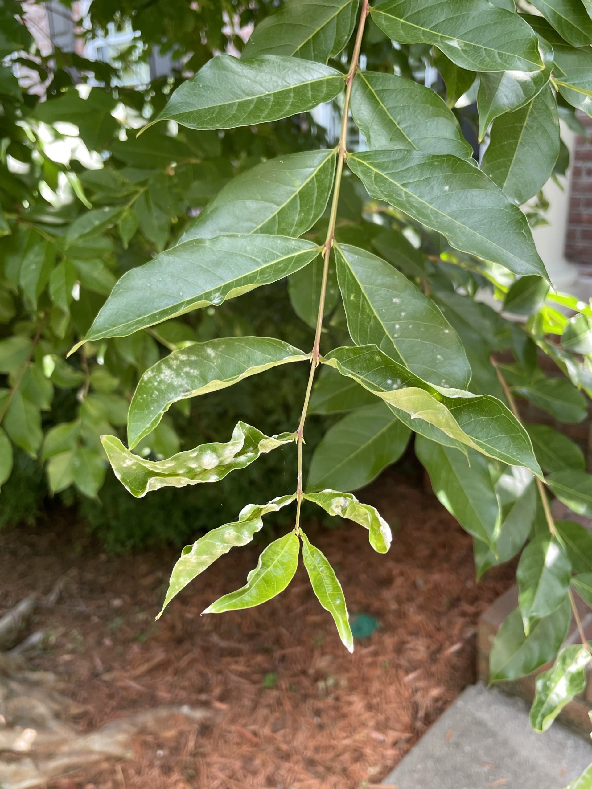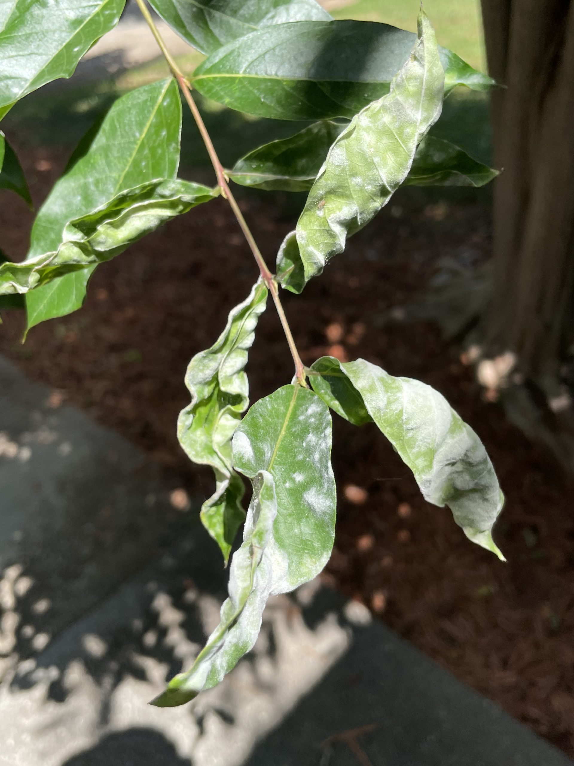 25 year old crepe myrtles – whitish blotches appearing on leaves toward end of some lower stems, and leaves starting to wither. No prior health issues with these trees. Ideas? Treatments?