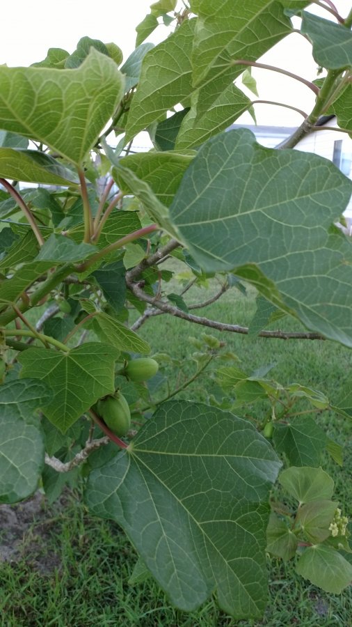 Looks like Jatopha curcas, some of the common names include Barbados nut, curcas bean, Brazilian stinging nut, etc… Check out the link below for more information. Best wishes! https://keyserver.lucidcentral.org/weeds/data/media/Html/jatropha_curcas.htm