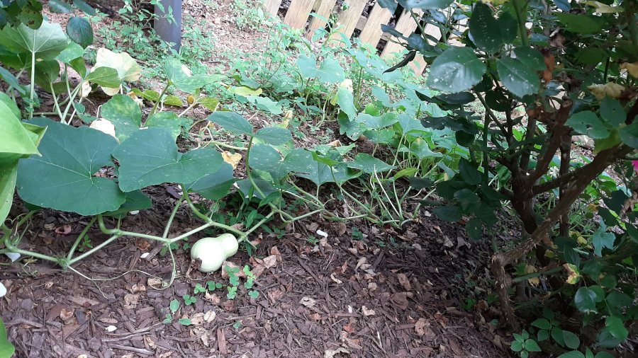Last year I emptied my composter here. This vine is growing under my roses and has 4 squash. Will these be edible and if so what should I do? Do they need fertilizer, should they be raised up off the ground? When should they be picked, and will they grow up the roses? Any advice would be appreciated.