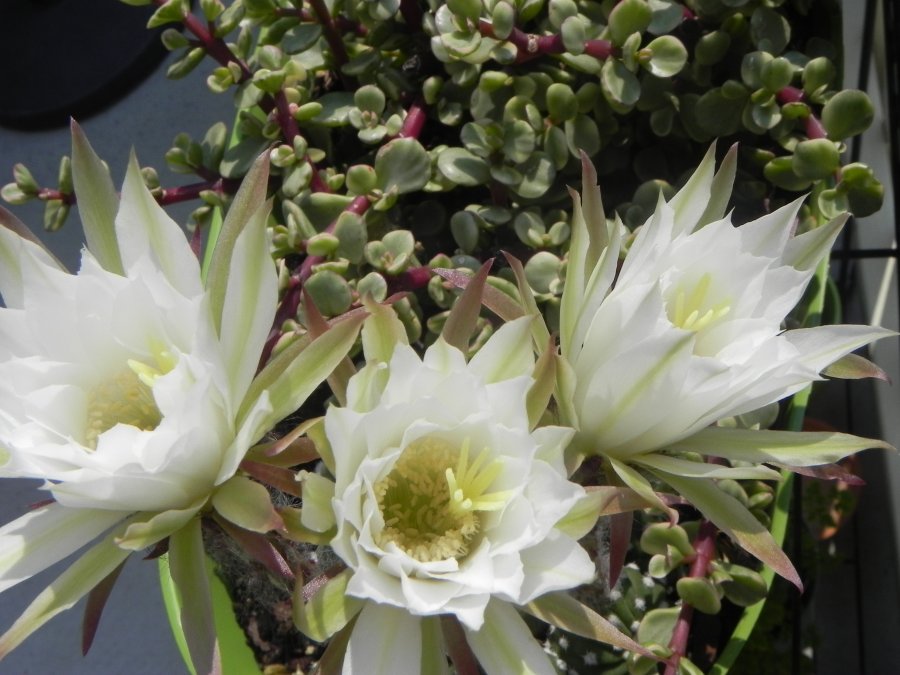 On the three white flowers in the first photo, I think they might be a type of cactus flowers? Check out the included link below for image of cactus flowers. But with out more information, I’m only speculating. We need to see the plants stems to narrow down the ID. https://www.cactuspro.com/photos/Cactaceae/Echinopsis/albispinosa/4198.html