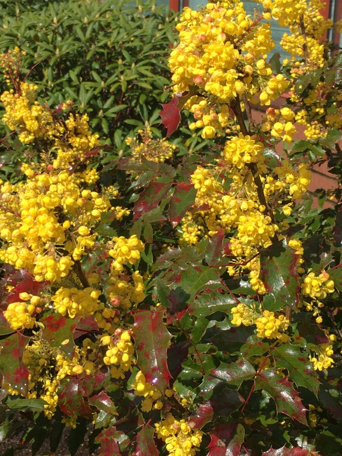 Maybe a type of Mahonia? Possible the Oregon grape (Mahonia aquifolium) or one of its cultivars? Check out the included link below for more information. Click on images to enlarge. Best wishes! https://en.wikipedia.org/wiki/Mahonia_aquifolium