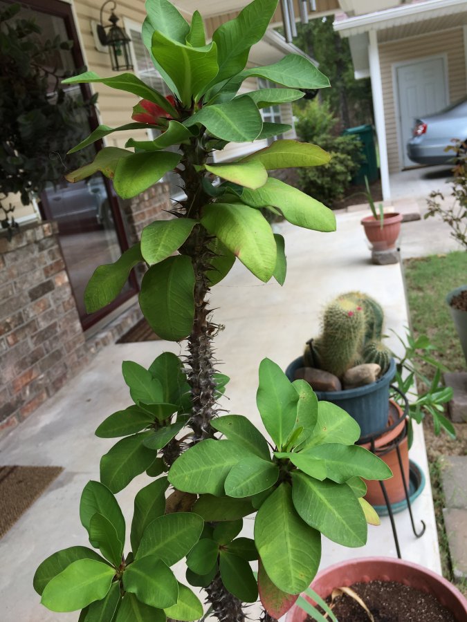 The leaves & spiny trunk looks like of those in the genus Euphorbia milii (crown of thorns). The flowers will confirm its ID. The semaphore/telegraph plant is Codariocalyx motorius.The included link below is crown of thorns. Click on images to enlarge. Best wishes! https://en.wikipedia.org/wiki/Euphorbia_milii