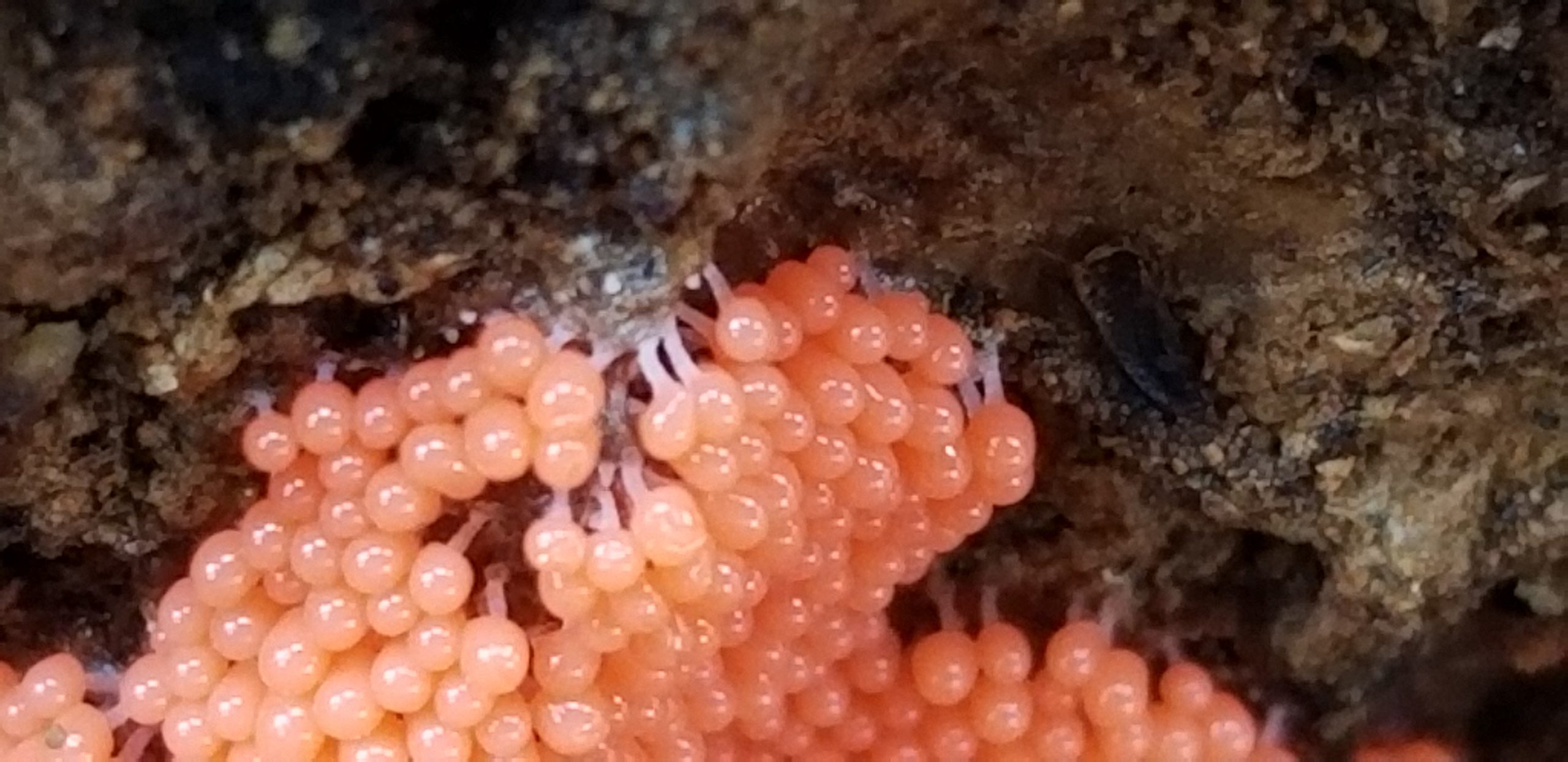 Bright orange growth with lots of 1mm round ovals attached by a clear/whitish tissue to surface of a fallen rotted damp pine wood. Perhaps a Slime mold, asking for more identifying information. We revisited the site the next day, on the 2nd day previous growth was brown and new grow was near by.