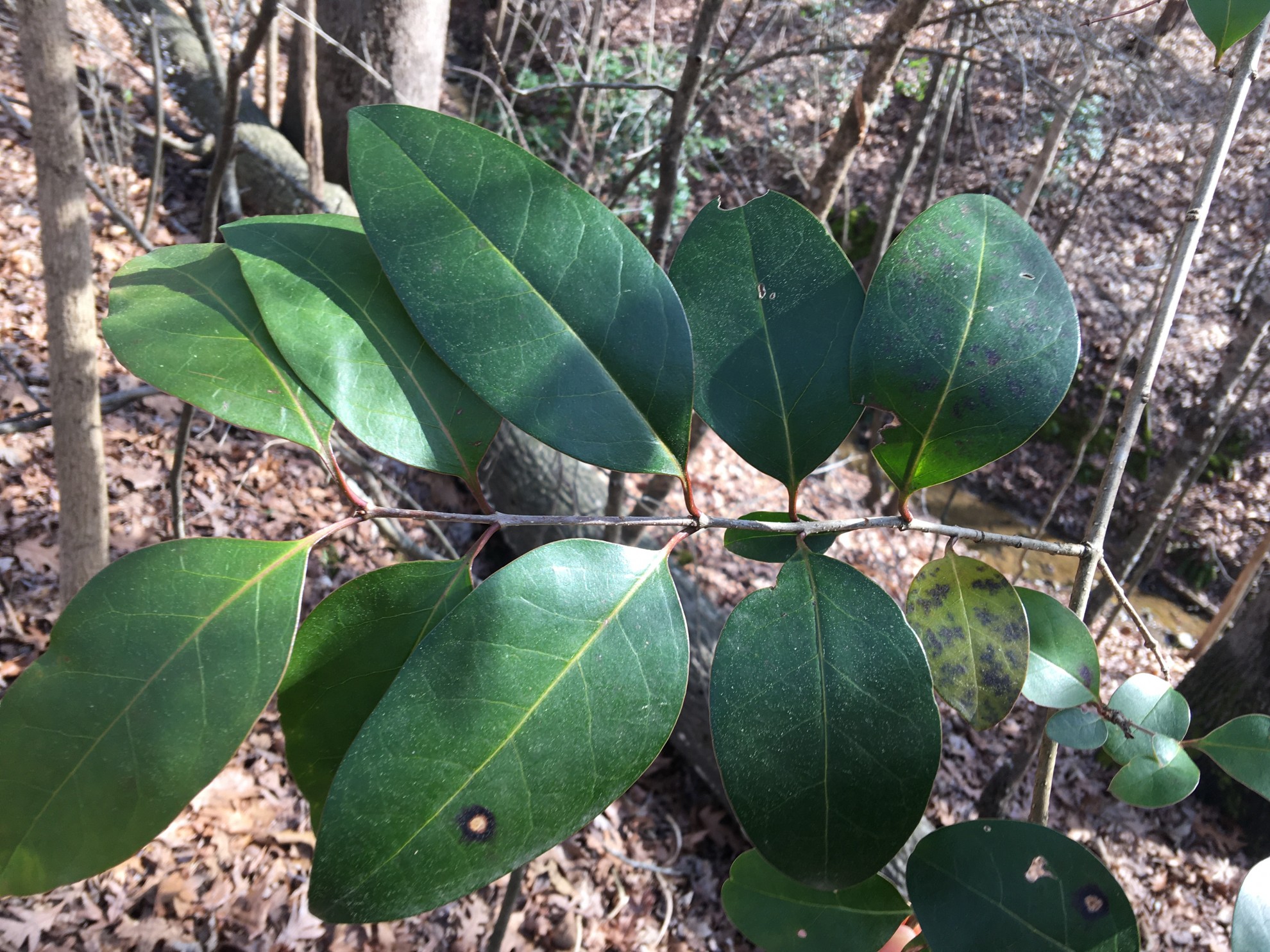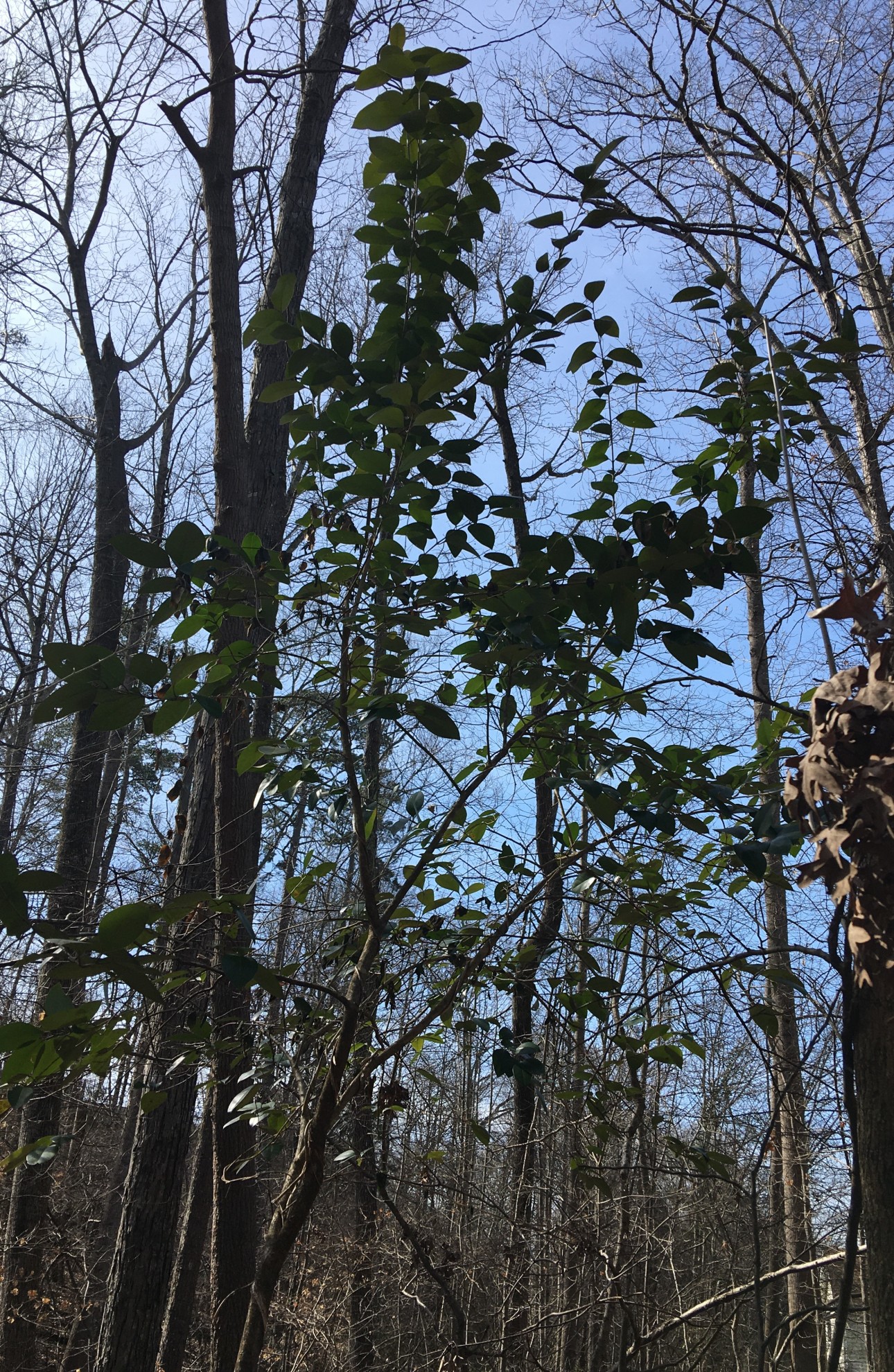 From the woods behind my house. This specimin is about 9′ tall but others in the woods are shorter. Evergreen. Has leathery leaves so I categorized it as a shrub. Very plain leaves. I have not noticed a bloom or seed.
