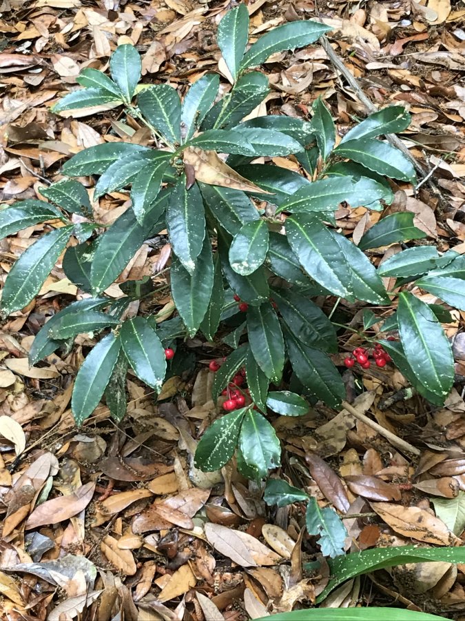 Maybe some thing in the Ardisia genus, possible coral berry (Ardisia crenata)? Check out these included links for information and see if you have a match. Click on images to enlarge. Best wishes! https://keyserver.lucidcentral.org/weeds/data/media/Html/ardisia_crenata.htm