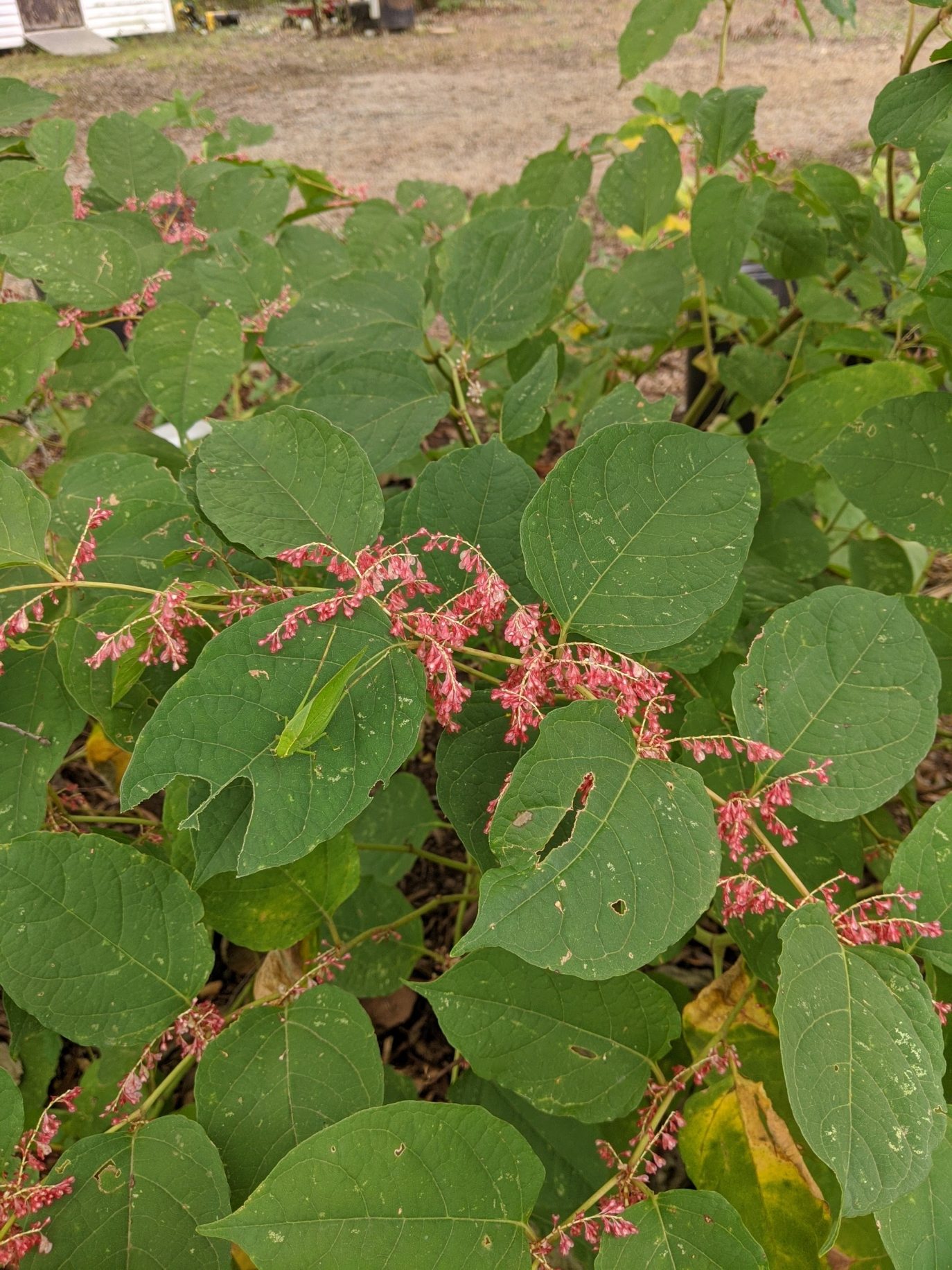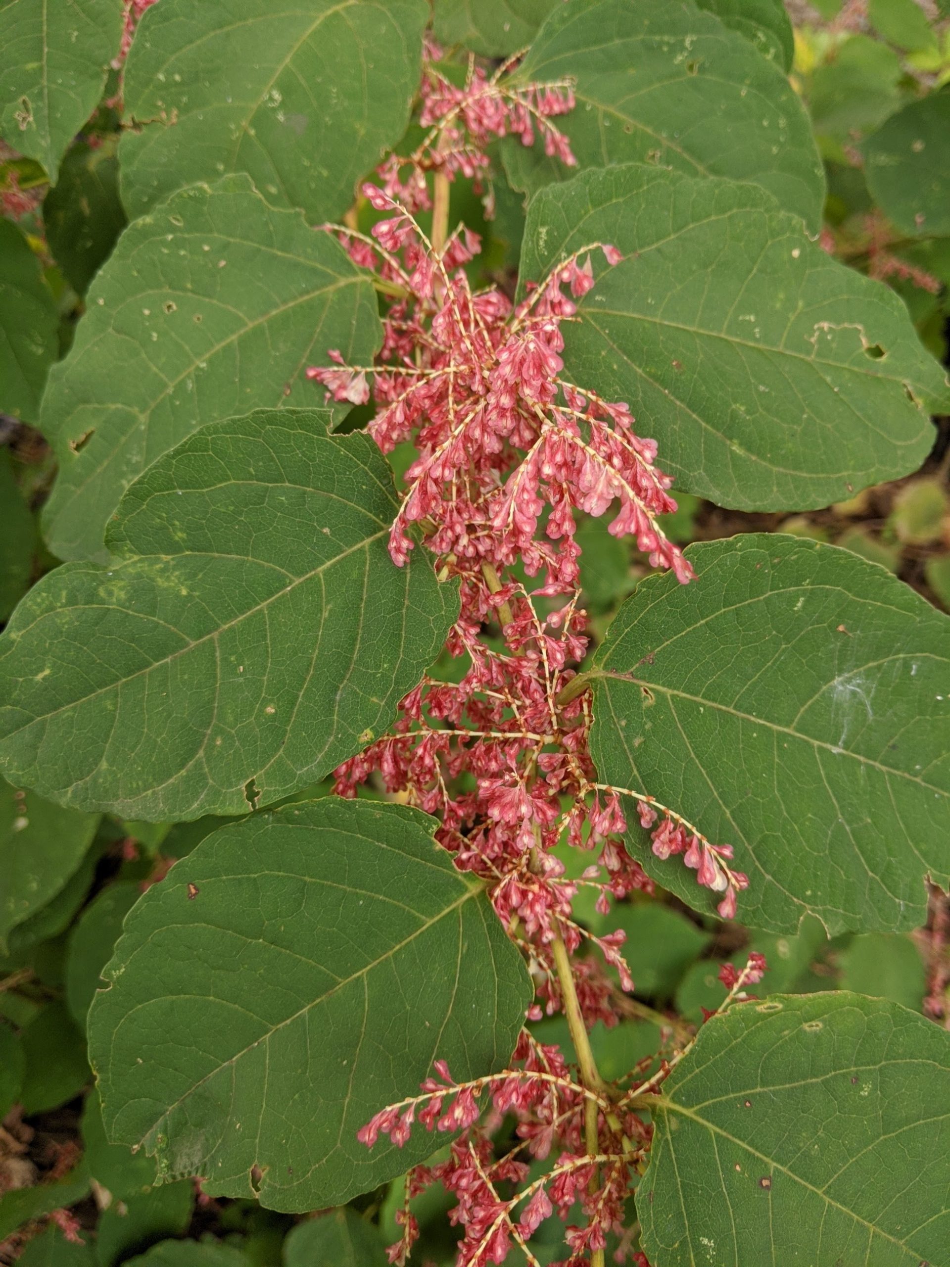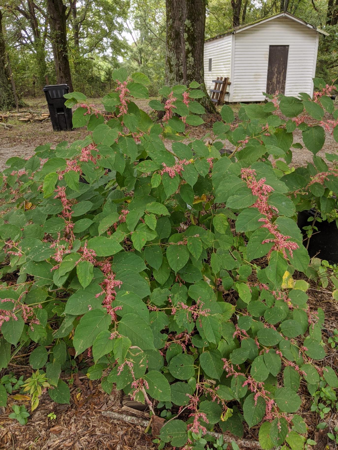 Bamboo type stalk. Comes back annually with more growth. Haven’t measured but some stalks are 6 or 7 ft tall. Flowers are pinkish and I cannot find any species of knotweed that matches this plant.